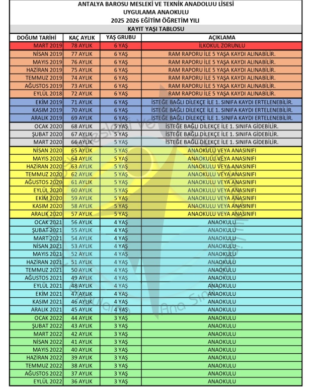Antalya Barosu Mesleki ve Teknik Anadolu Lisesi Uygulama Anaokulu’nda ön kayıtlar 1 Temmuz - 20 Temmuz tarihleri arasında gerçekleştirilecektir.